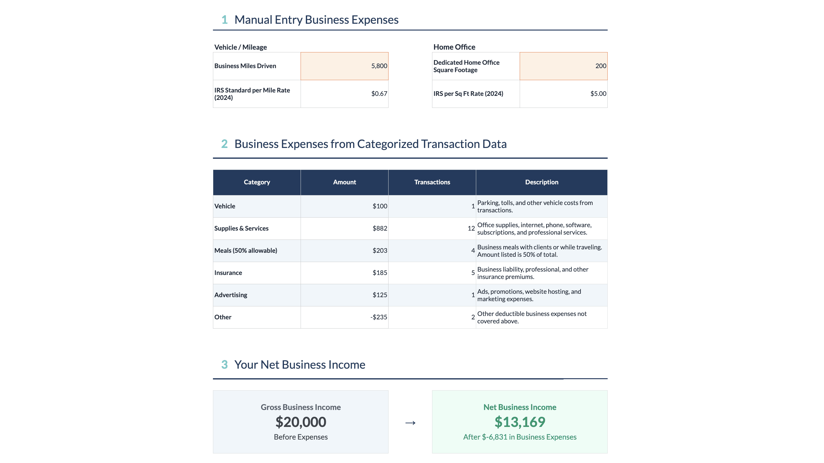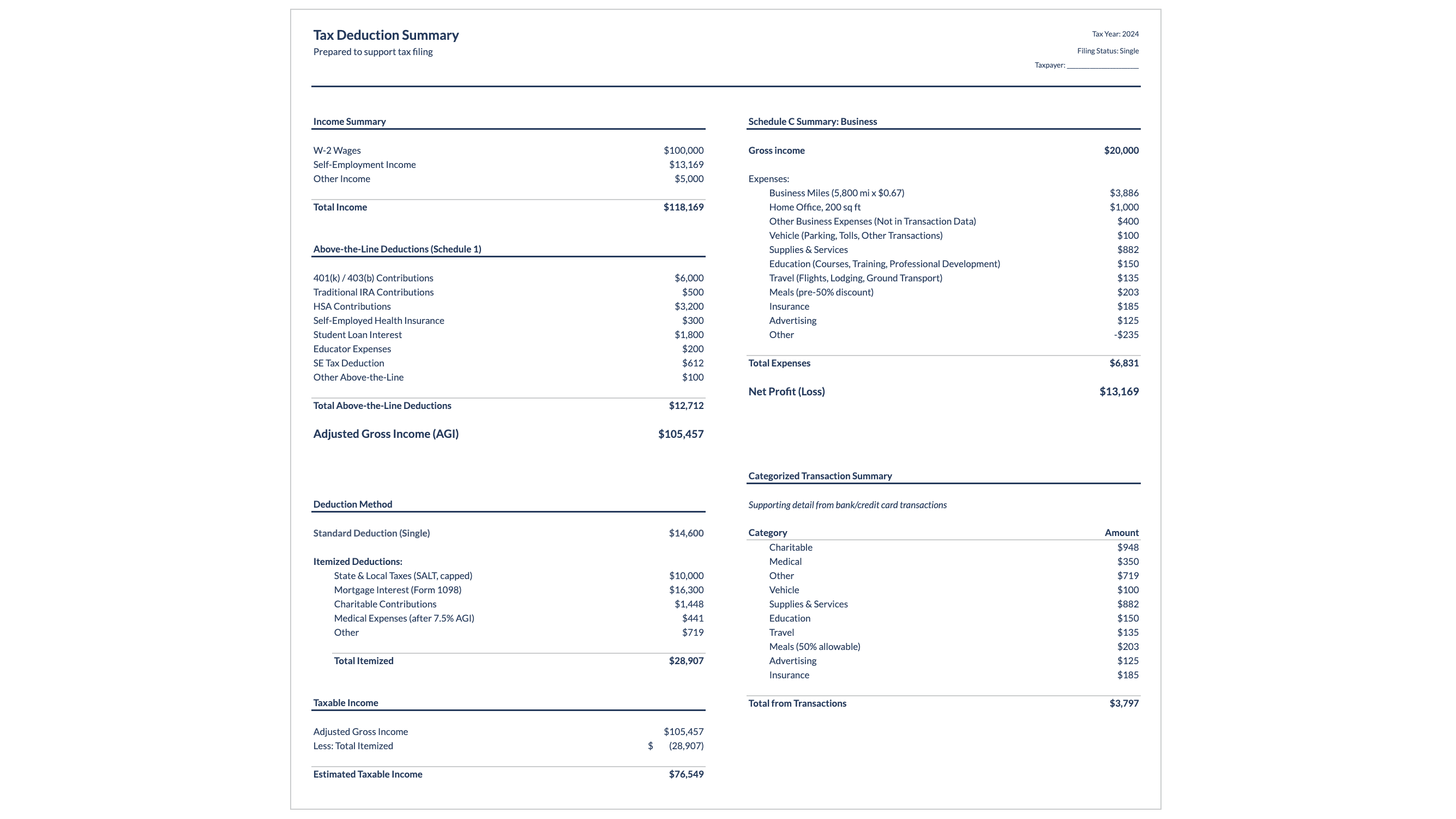 See your estimated tax savings across 3 layers: AGI reduction, itemized vs. standard and business deductions